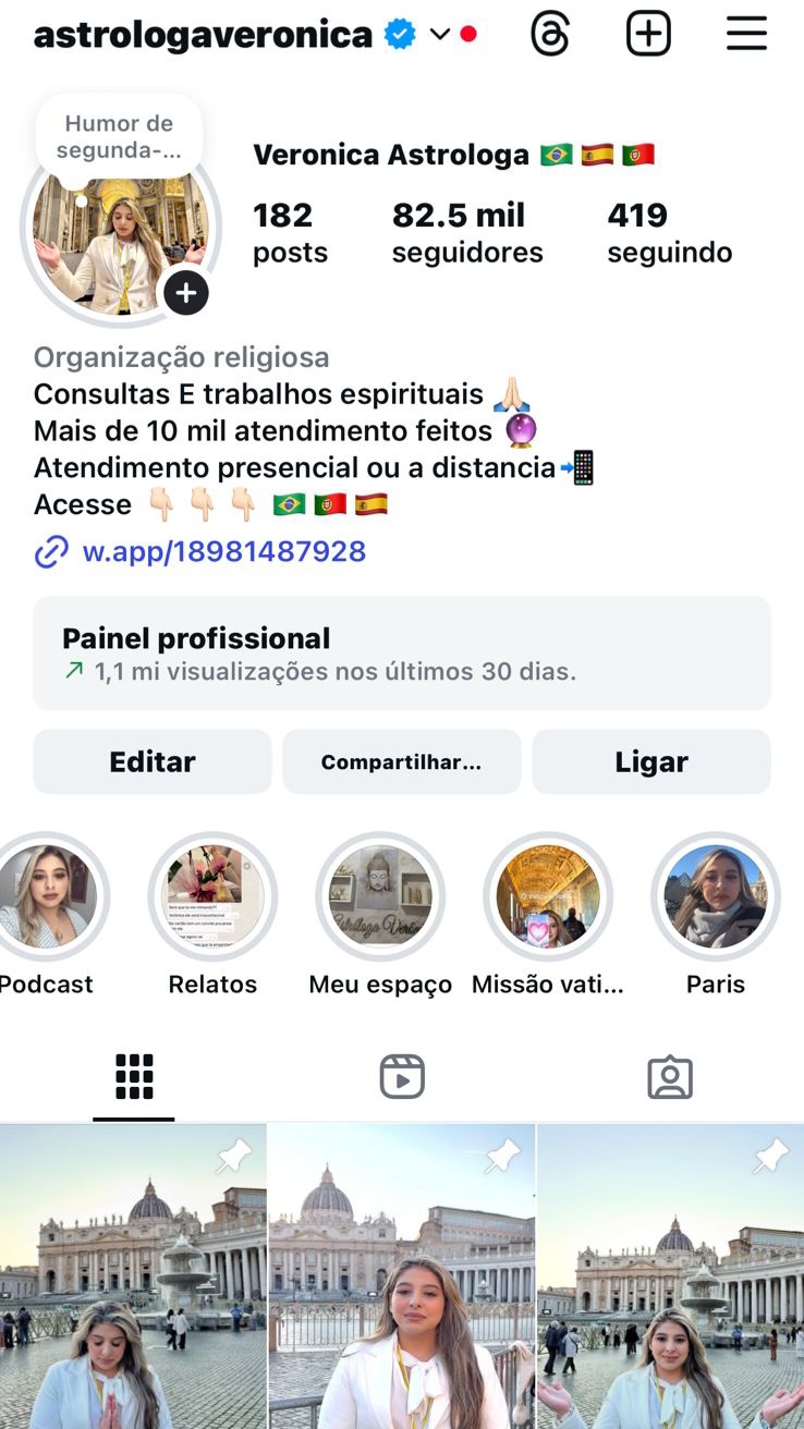 🔮💫Eu sou astróloga Verônica, consagrada pela federação brasileira de umbanda há mais de 20 anos possuindo mais de 80 mil seguidores em meu Instagram. Com meu dom hereditário, ajudado pessoas de todos os lugares. Com objetivo de dar o direcionamento certo que você precisa. Através de linhas brancas, eu posso te ajudar sendo especialista em união de casais no lado espiritual, profissional. Curas de vícios, depressao, saúde, amor! Eu posso te dar a ajuda certa em todas as areas que você desejar, Seu problema tem solução! 🔮✨